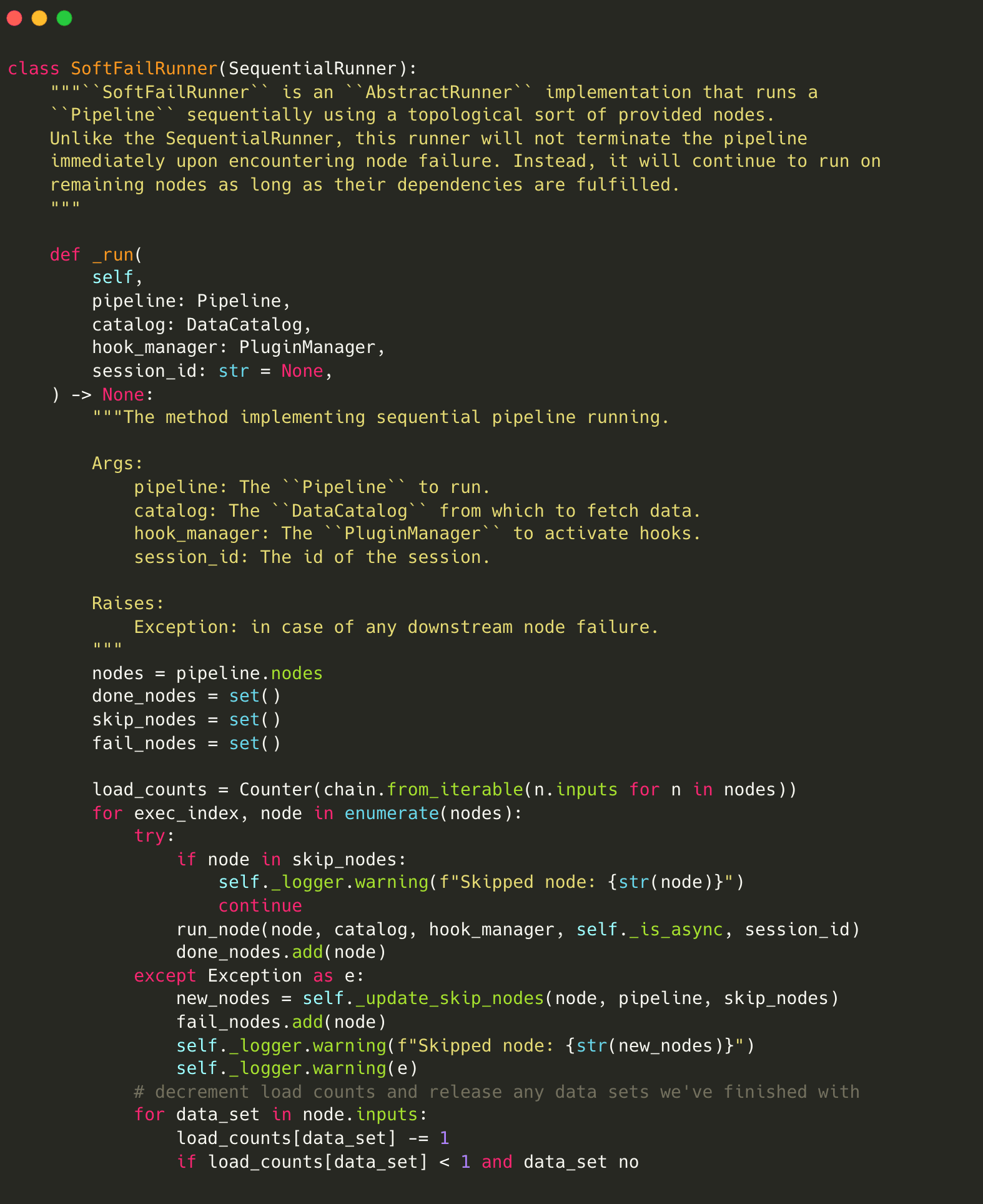 The resulting SoftFailRunner is an implementation of AbstractRunner that runs a pipeline sequentially using a topological sort of provided nodes. Unlike the built-in SequentialRunner, this runner does not terminate the pipeline but runs any remaining nodes as long as their dependencies are fulfilled. The SoftFailRunner implementation adds two arguments: --from-nodes and --runner.The essential code for the SoftFailRunner is shown below and the full code can be found on GitHub.