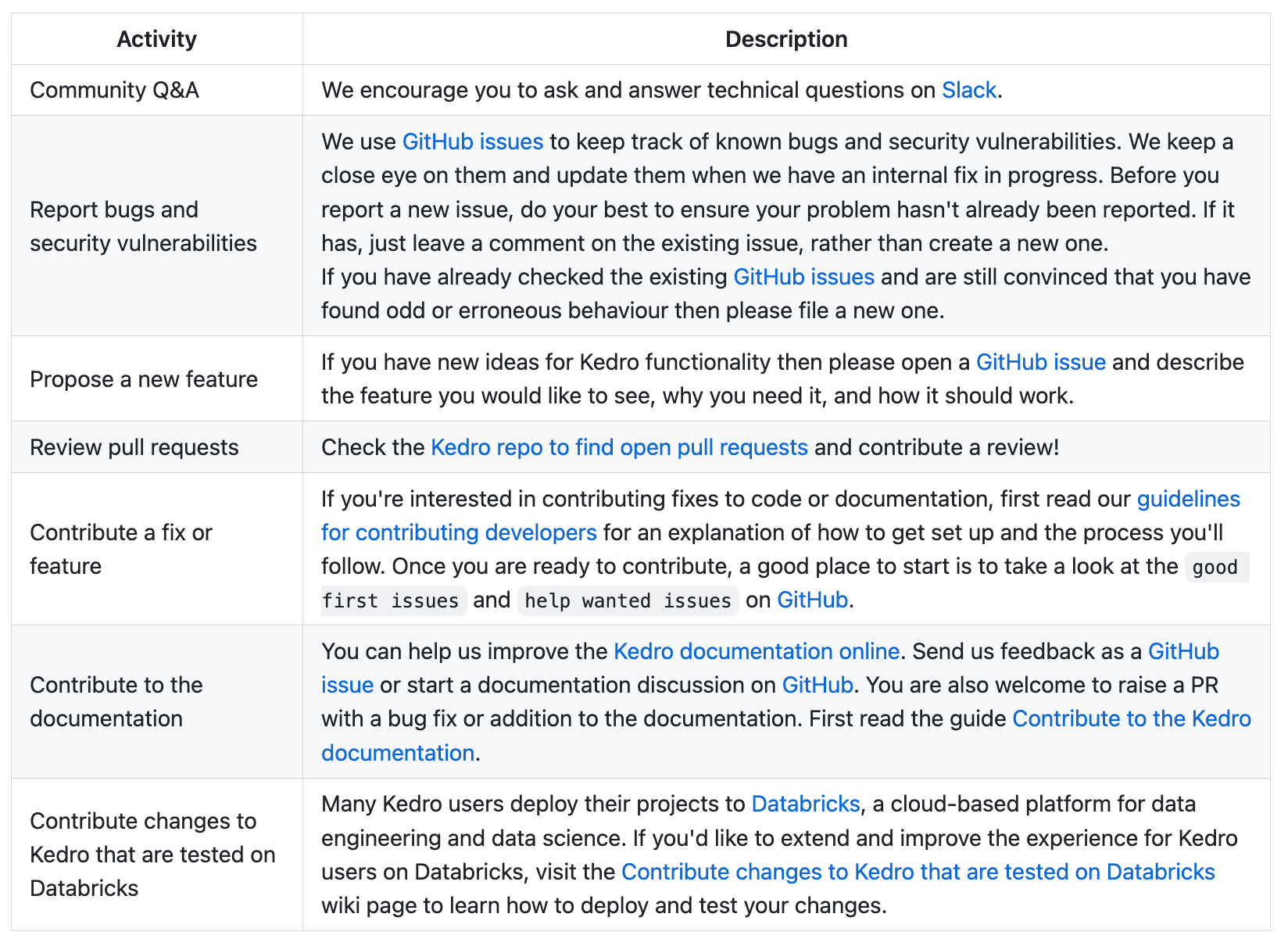 We reworked the Kedro contributors guide in August, and moved it to the Kedro wiki. There are loads of different ways to contribute to Kedro and if you want to get involved, we encourage you to look at the table that introduces the Kedro contributor guide.